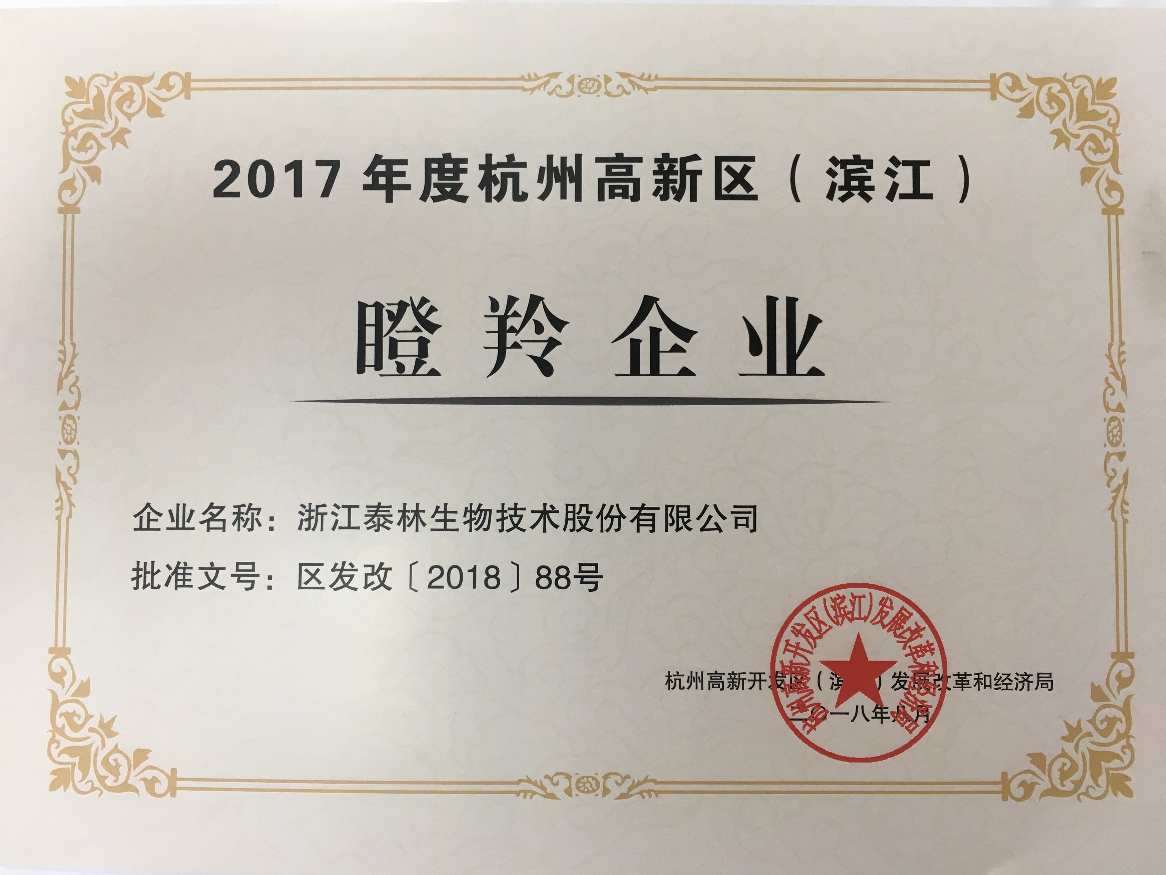 2018年8月下旬,2017年度高新區(濱江)瞪羚企業名單公布,浙江泰林生物技術股份有限公司榜上有名,標志著泰林生物連續3年獲評高新區(濱江)瞪羚企業稱號。
